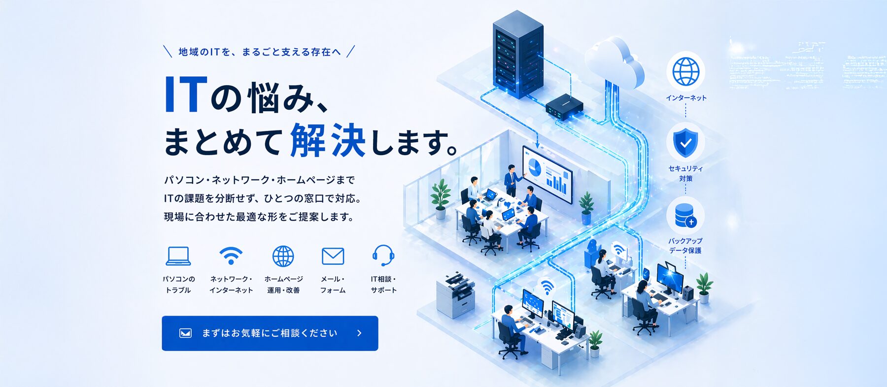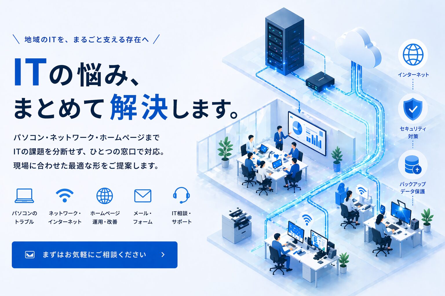 パソコン故障・不具合・ネットワーク構築・ホームページ作成・管理更新など お気軽にネットコムにご相談ください。
